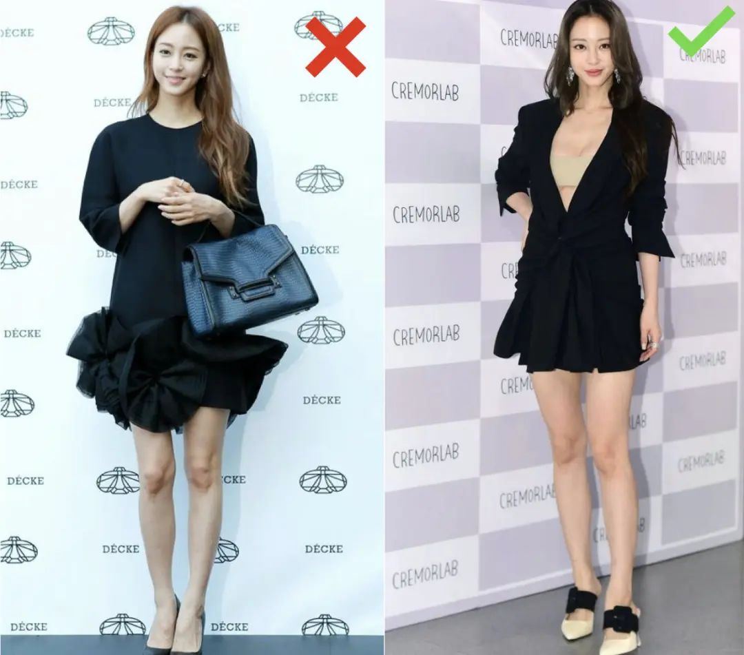 再有,狐系长相可以尽量去选择一些女性元素强的单品,例如各种小高跟或者修身设计的服装。像下图,同样都是黑色连衣裙,左边的宽松版型搭配上圆领,看着就显得有些笨重平庸,而右边这种不仅勾勒出了身形,再加上大面积的露肤,不容忽视的女明星气场一下子就发挥出来了!