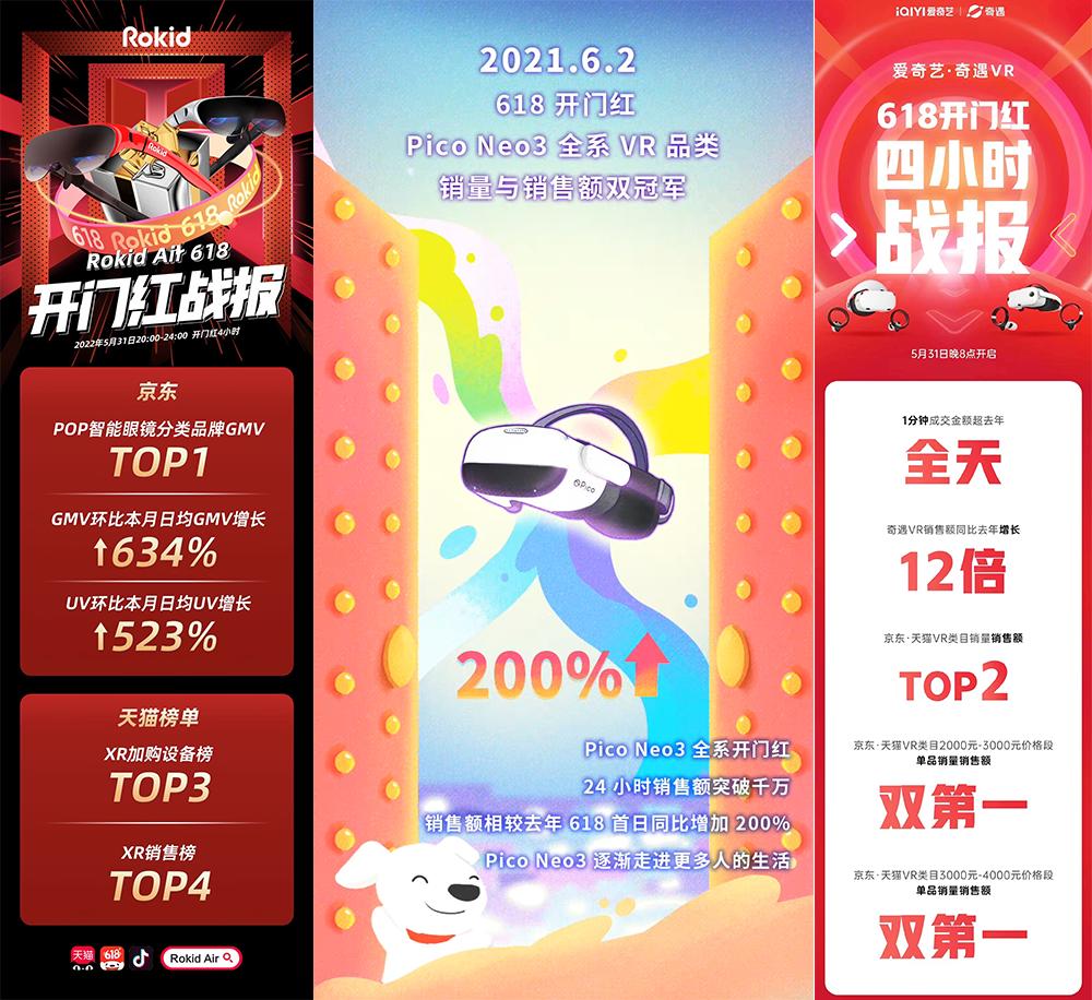 ▲从左到右分别为Rokid、Pico、爱奇艺奇遇的618首日战报不仅如此,2022年以来,不少AR眼镜厂商纷纷推出自己的消费级AR眼镜,INMO Air、雷鸟Air、Nreal Air、Rokid Air等AR眼镜逐渐成为国内消费级AR眼镜市场的主力军。同时,据消息人士透露,今年下半年将会有多款消费级VR头显发布。