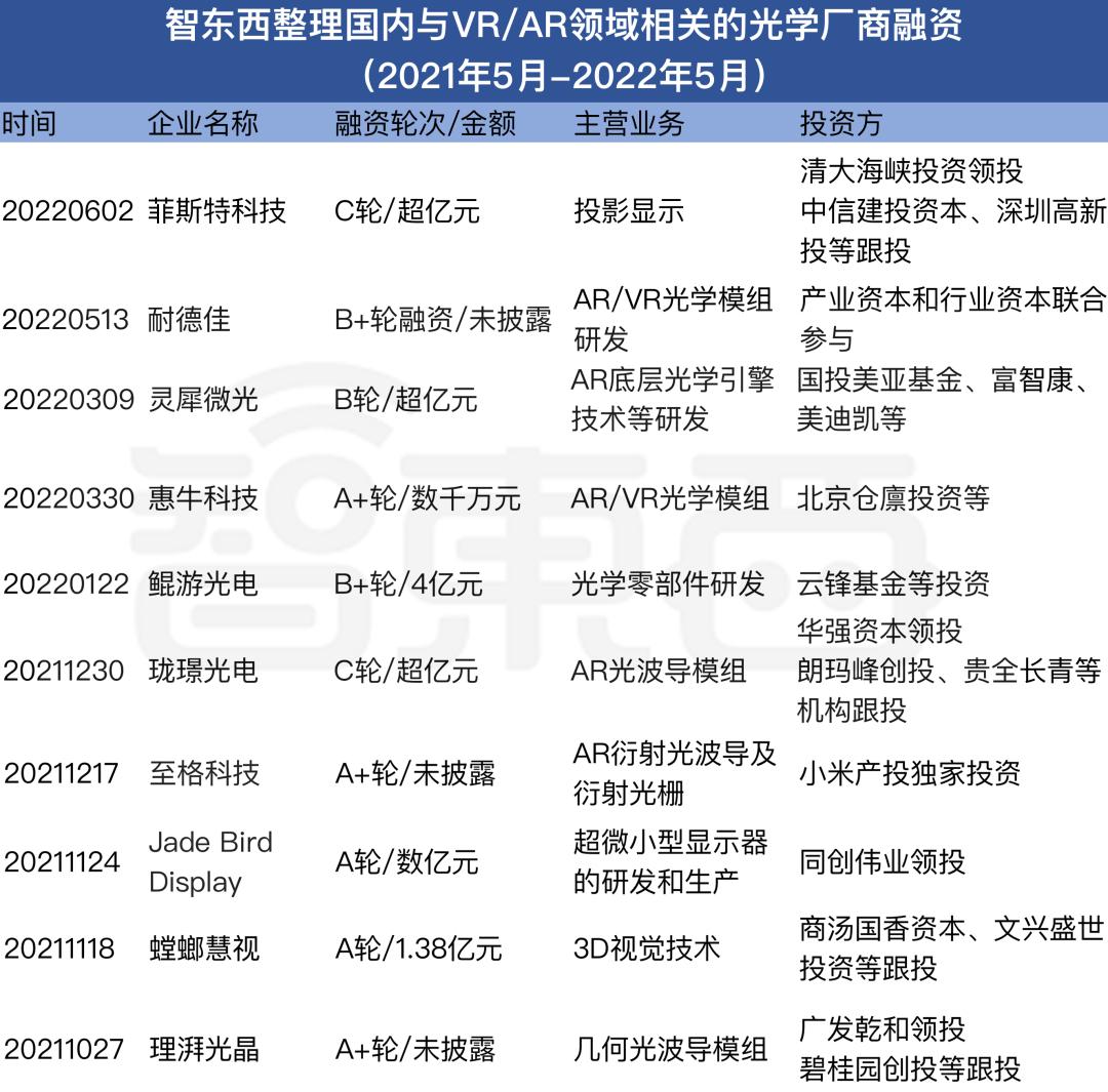 据智东西不完全统计,过去一年时间,至少有10家涉及VR/AR领域的光学厂商获得了新一轮的融资,而其背后的投资人不乏小米、商汤等跨领域玩家。