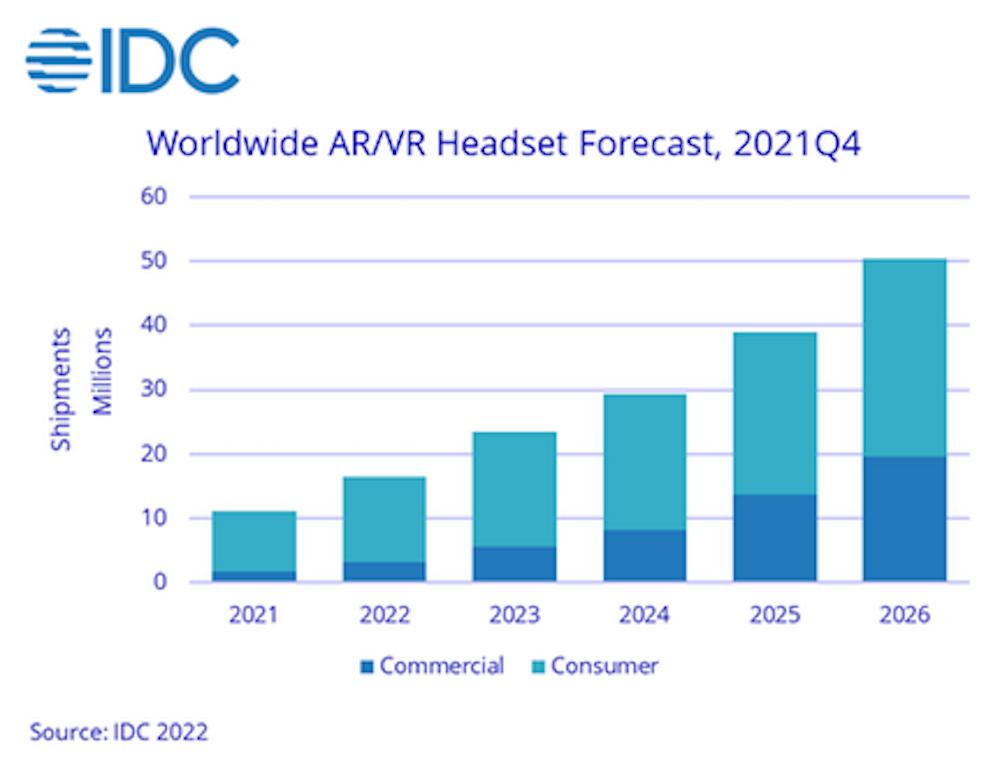 国际调研机构IDC预测,2021年全球AR/VR头显出货量达到1120万台,同比增长92.1%。到2026年,中国AR/VR市场规模将超130亿美元。