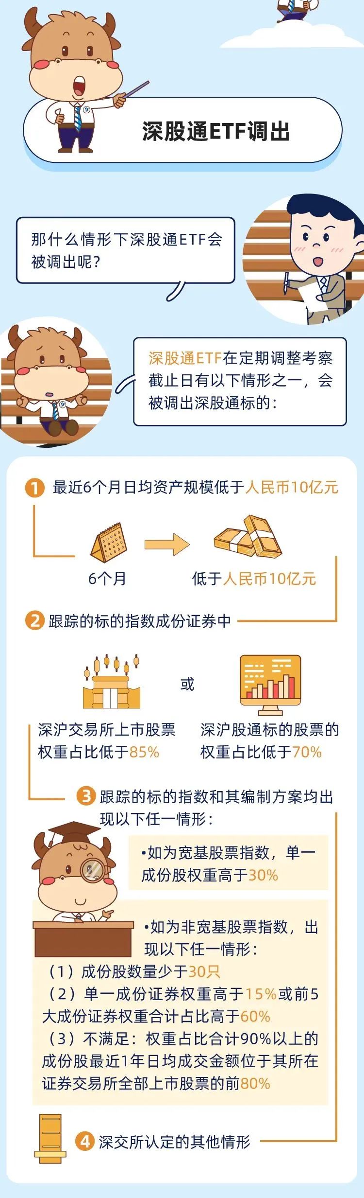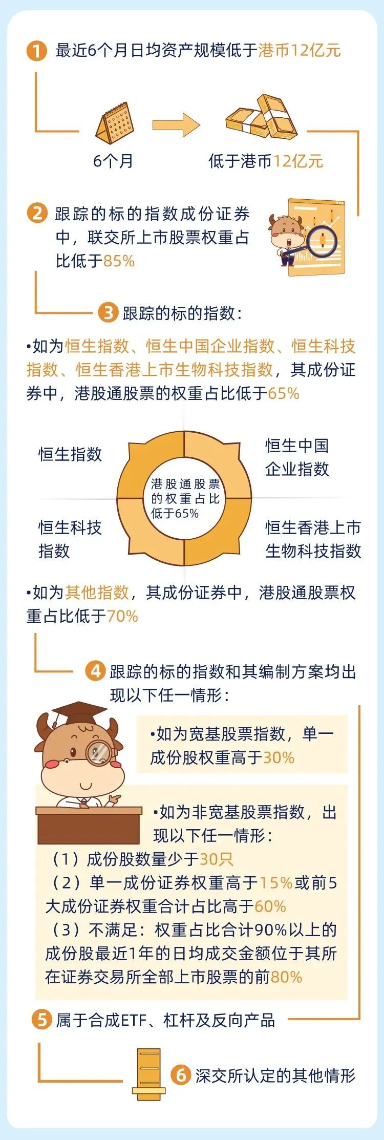 其一,上市时间满6个月,跟踪标的指数发布时间满一年;其二,内地市场ETF过去6个月日均资产规模不低于15亿人民币,成份证券以深沪股通标的股票为主;其三,香港市场ETF过去6个月日均资产规模达17亿元港币,成份证券以港股通标的股票为主;此外,不属于合成ETF、杠杆及反向产品。