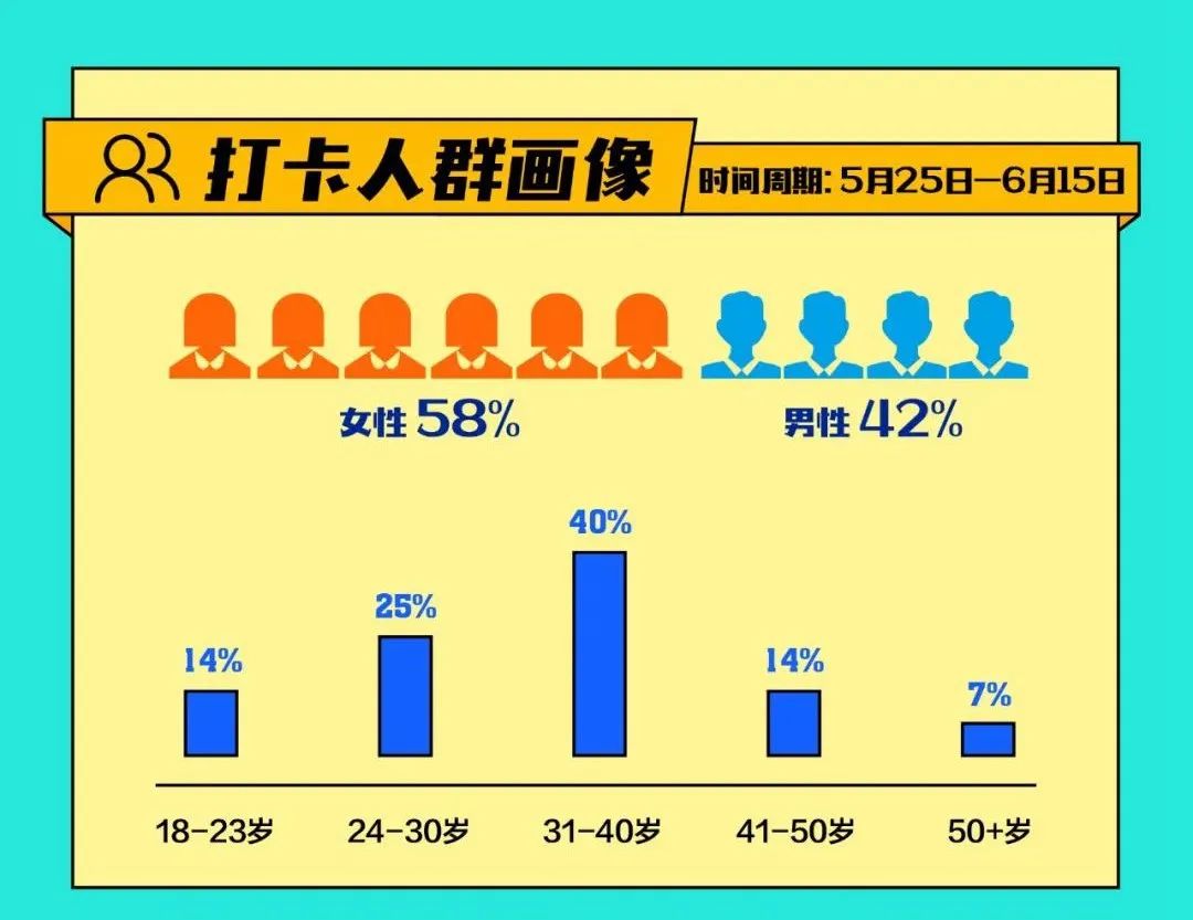 “打卡人群画像”的结果显示,炎炎夏日里,最喜欢打卡的人群里女性比例占到了58%。31-40岁的女性占了40%。