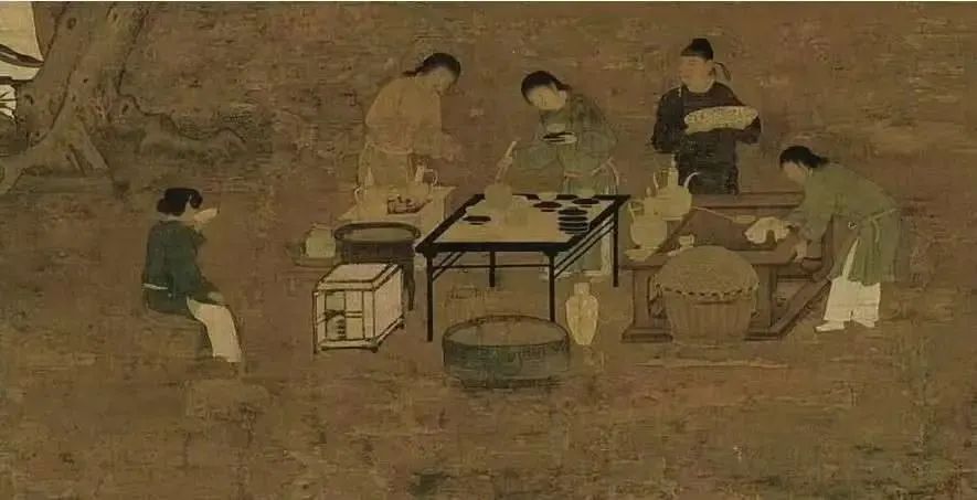 北宋 赵佶 文会图(局部)具体而言,宋代点茶大致可分为12个步骤,即:列具-炙茶-碾茶-罗茶-烧水-燲(xié)盏-置茶-候汤-调膏-冲点击拂-鉴赏汤花-闻香尝味。