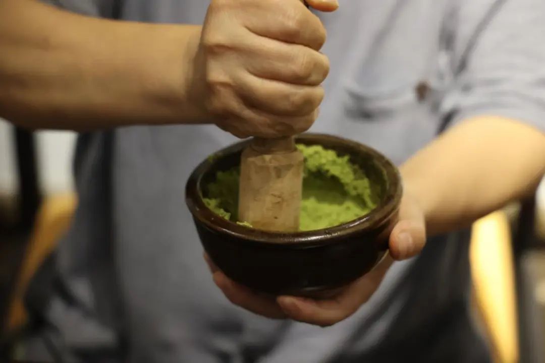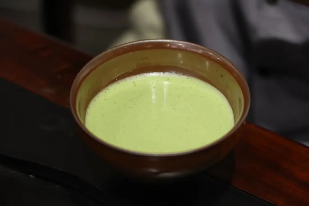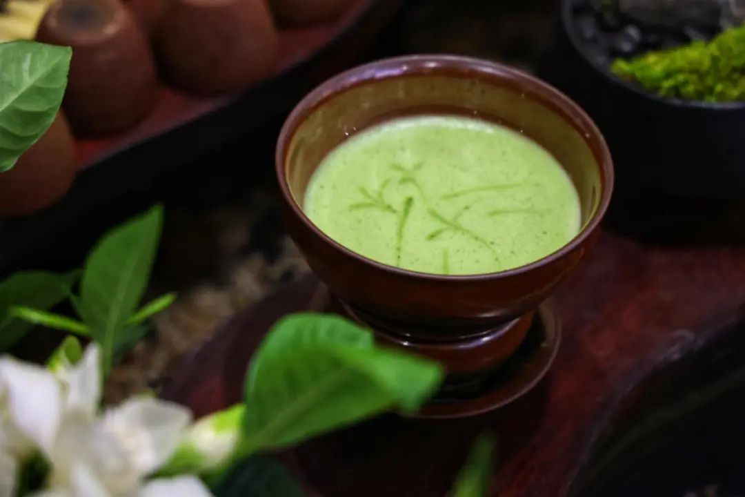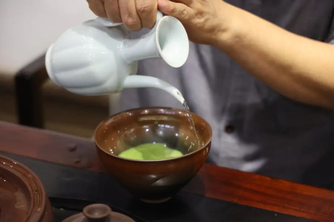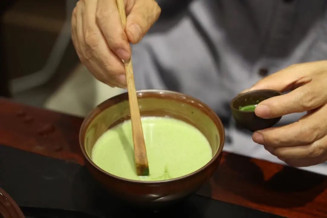 一碗茶汤已完成点茶讲究茶粉与水的比例,这也是一碗好茶的关键。茶粉往往少至只有一据指甲盖大小, 而水则要足够多,分几次注入,每次注水都需充分搅拌。