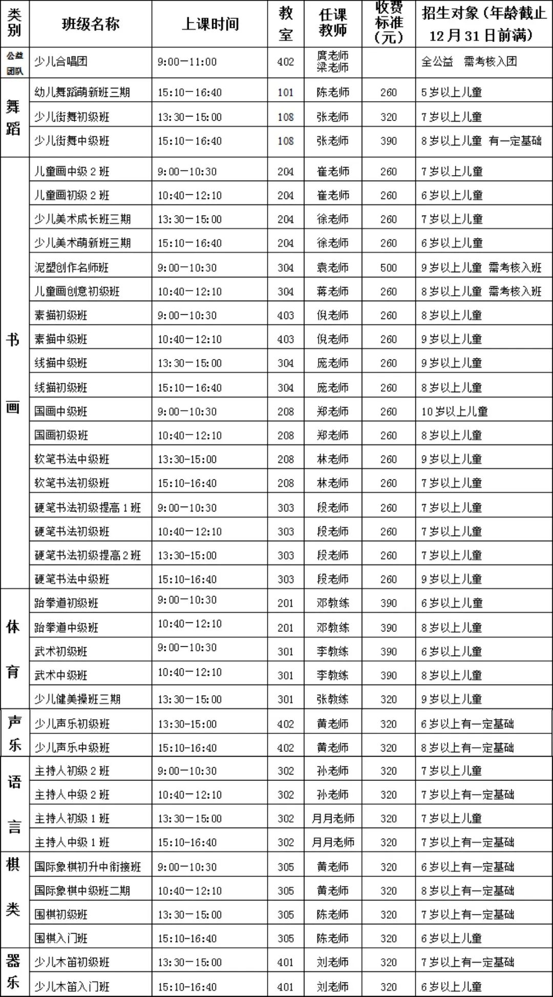 备注:1.各班十人以上开班,不足十人,由青少年宫决定是否开班、调班、合班。