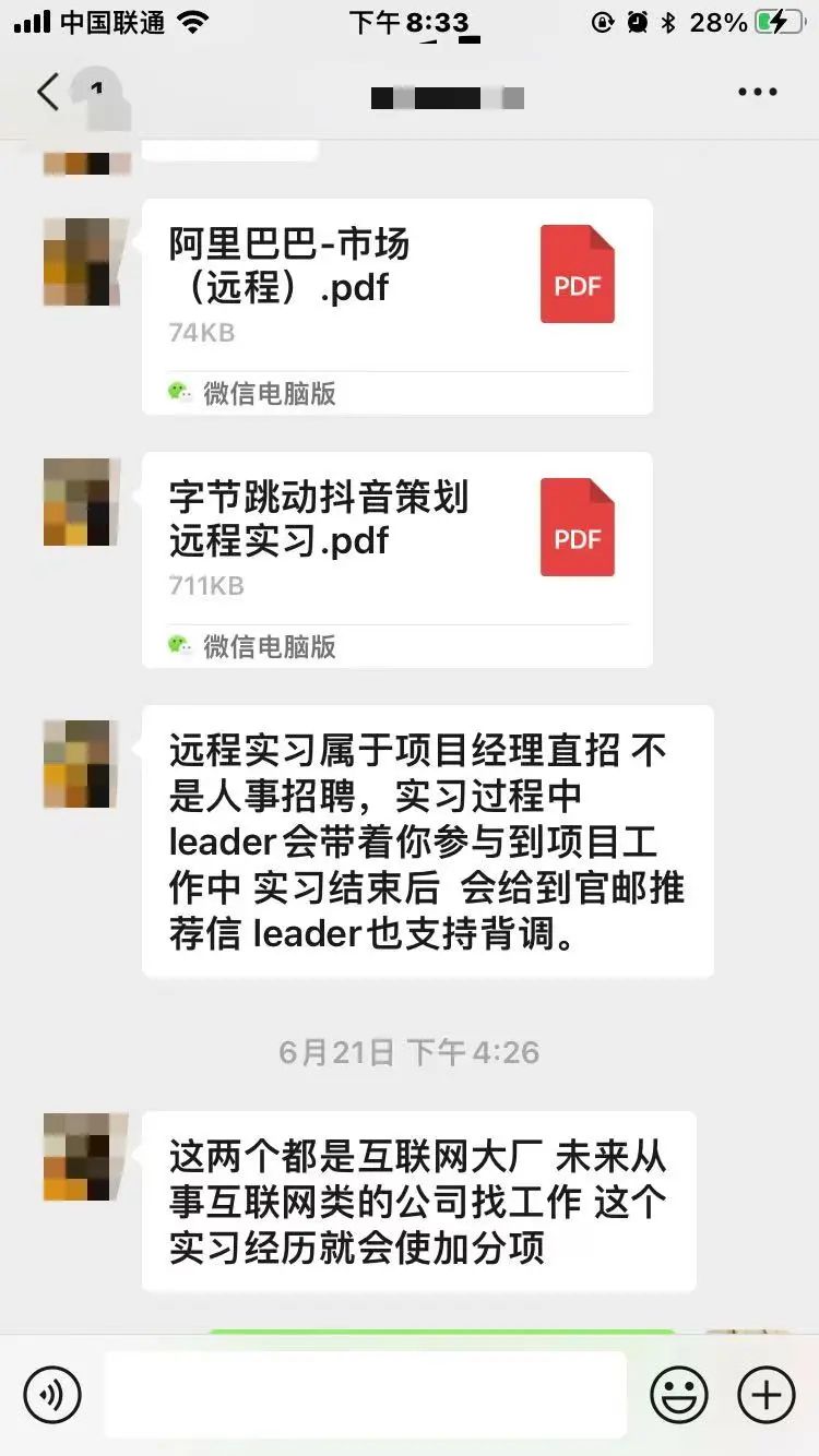 付费意味着一些保障,但这种保障非常有限。该中介表示,这类实习不仅能够“保进”还能够支持申研求职背调。但这种“申研求职背调”的适用范围非常有限,比如高校通常需要的“实习证明”就不包含在该实习能提供的证明文件中。“远程实习的话是项目经理直招,不是人事招聘,没有实习证明。但实习过程中leader会带着你参与到项目工作中,实习结束后,会给到官邮推荐信,leader也支持背调。”该中介回复蓝鲸记者。