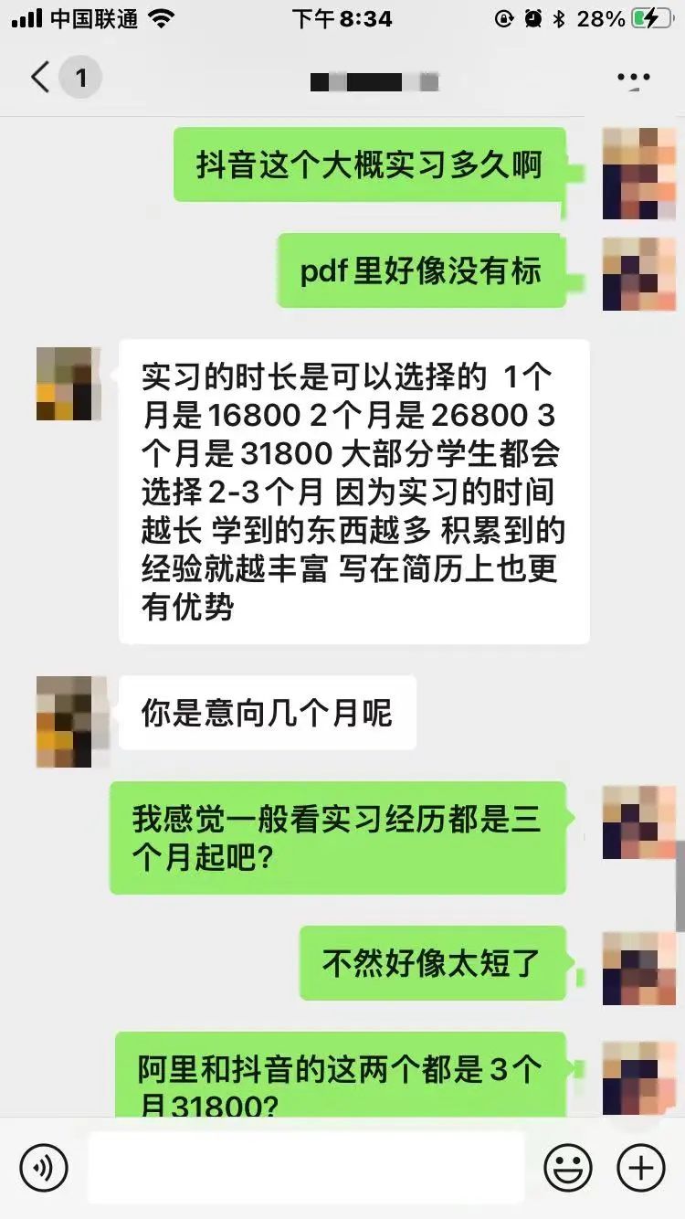 实习岗位多为运营类与策划类,不过此类实习并非实地实习,按照该中介说法,他们提供的主要为远程实习,费用在1-3w之间,如果实地实习价格将翻倍。中介表示:“价格与公司有关,同时也与实习的时长有关。1个月是16800,2个月是26800,3个月是31800。大部分学生都会选择2-3个月,因为实习的时间越长,学到的东西越多,积累到的经验就越丰富,写在简历上也更有优势”。
