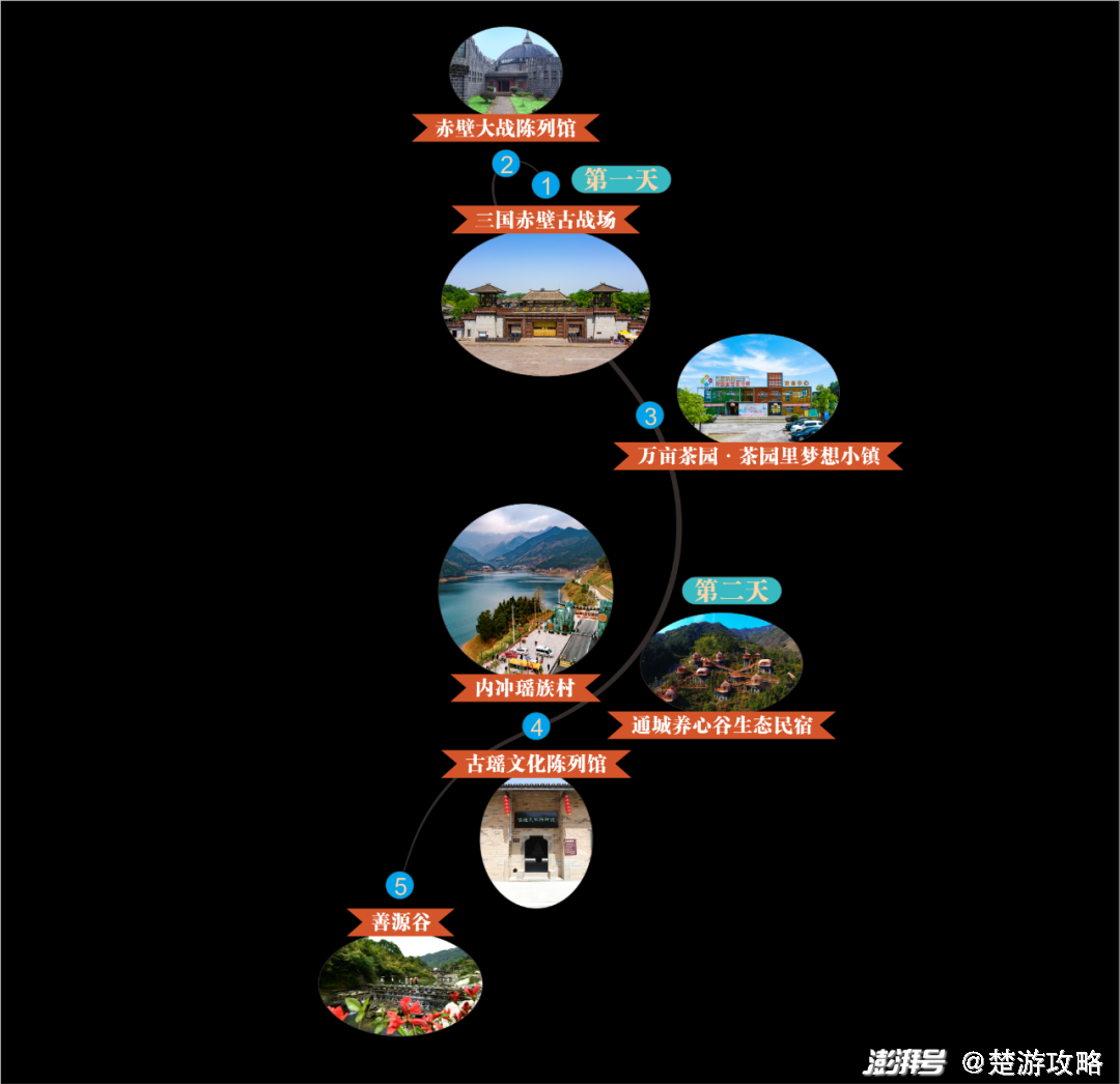 线路概况DAY1:三国赤壁古战场(游览、午餐)——赤壁大战陈列馆——万亩茶园·茶园里梦想小镇(游览)——养心谷生态民宿(晚餐、住宿)
