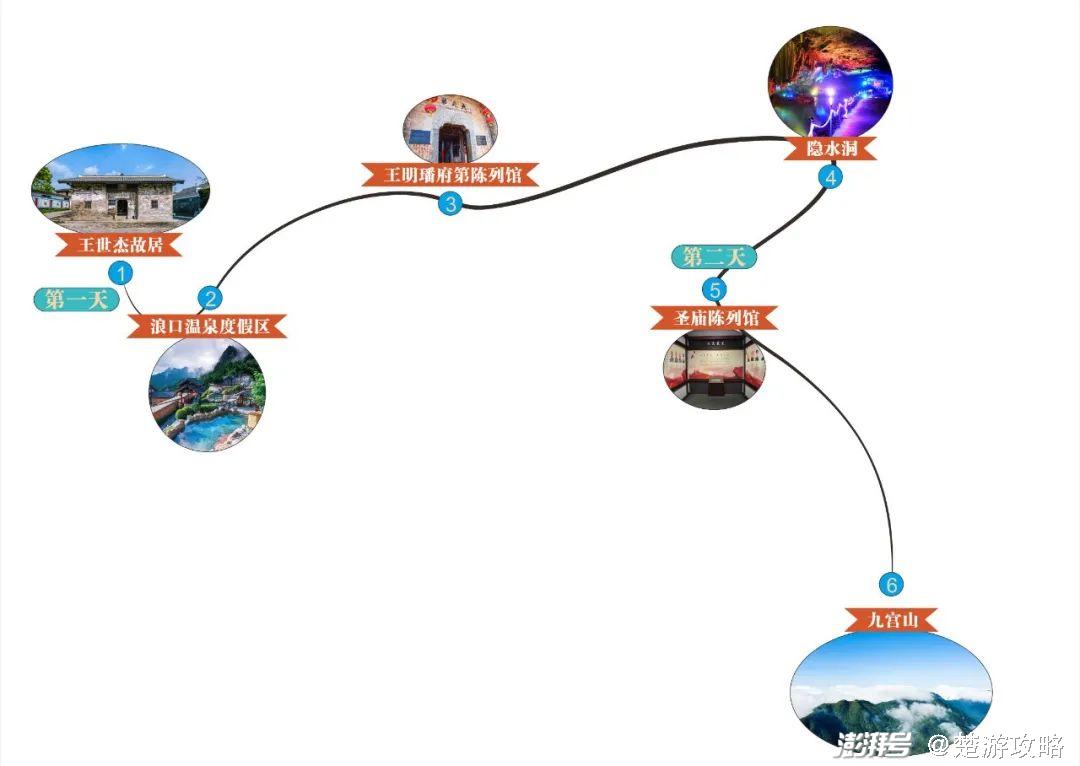 线路概况DAY1:王世杰故居(参观)——浪口温泉度假区(游览、午餐)——王明璠府第陈列馆(参观)——隐水洞(游览)——隐水山庄(晚餐、住宿)