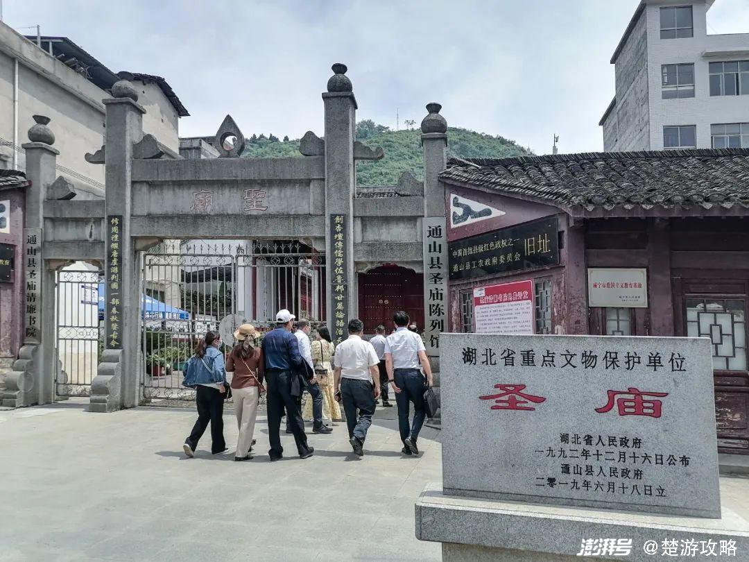 圣庙于现为省级文物保护单位,省级爱国主义教育基地,市级家风教育基地,于北宋庆历四年(1044年)众邑人募资而兴。明嘉靖年间,庙荒芜,邑人朱廷立(明吏部侍郎)捐修。1813年通山县府儒政进行大修。清末至建国初直为政府驻地。圣庙是历代以来,人们崇尚孔圣的场所,社会地位至高无上。圣庙通常依山傍水而兴并遵从儒学所需的制式规定,分别在各进设置应有的功能设施。通山圣庙地势上坐北朝南,各进逐势提高,平面布局上分别为棂星门、大成门、乡贤祠、名宦祠、东西庑、大成殿、崇圣祠和东西卫间组成,占地3200平方米,其中建筑占地2000平方米,成为境内学子、庠生、员外荟萃之地。地址:咸宁市通山县通羊镇四街圣庙巷6号