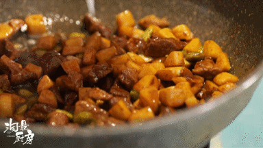在菜即将成熟时,在锅内淋入适当的水淀粉,使锅内的汤汁变得黏稠、也更入味。