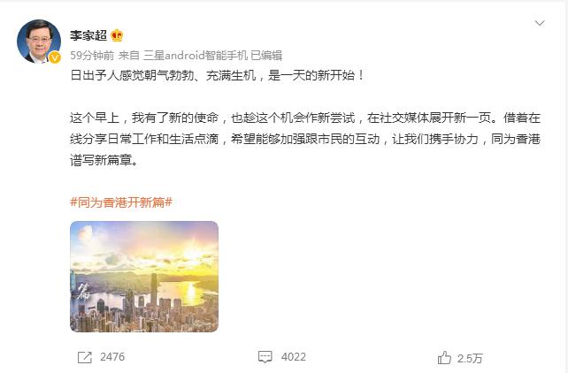 北京时间2022年7月1日6时22分,认证为香港特别行政区行政长官的@李家超 发微博写道:“日出予人感觉朝气勃勃、充满生机,是一天的新开始!这个早上,我有了新的使命,也趁这个机会作新尝试,在社交媒体展开新一页。借着在线分享日常工作和生活点滴,希望能够加强跟市民的互动,让我们携手协力,同为香港谱写新篇章。”