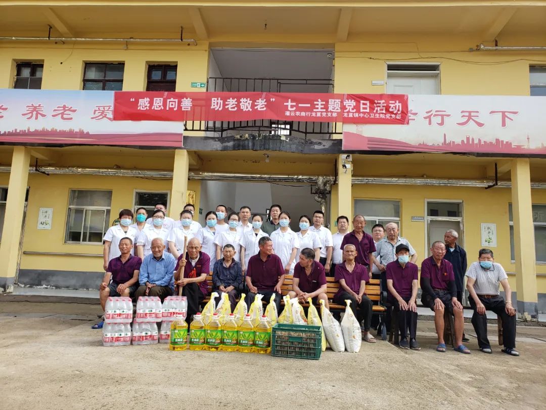 7月1日上午,龙苴镇民政办党支部、龙苴镇卫生院党支部、灌云农村商业银行龙苴支行党支部到龙苴镇敬老院,联合开展“感恩向善、助老敬老”七一主题党日活动,为老人送上志愿服务、献上爱心。