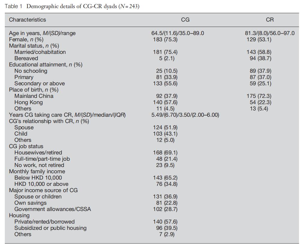 在本项目的介入过程中,共有243个案例完成基线访谈,其中201例完成随访,中止率为17.3%。就老年失智症照料者的性别而言,女性照料者(75.3%)比男性照料者更多,但被照料者的性别分布更为均衡(女性= 53.1%)。照料者和被照料者的平均年龄分别为64.5岁(范围为35 ~ 89岁)和81.3岁(范围为56 ~ 97岁)。参与项目的家庭照料者主要是配偶(51.9%)或子女(43.1%),平均照料年数为5.49年。表1详细描述了照料者和被照料者的人口学特征。