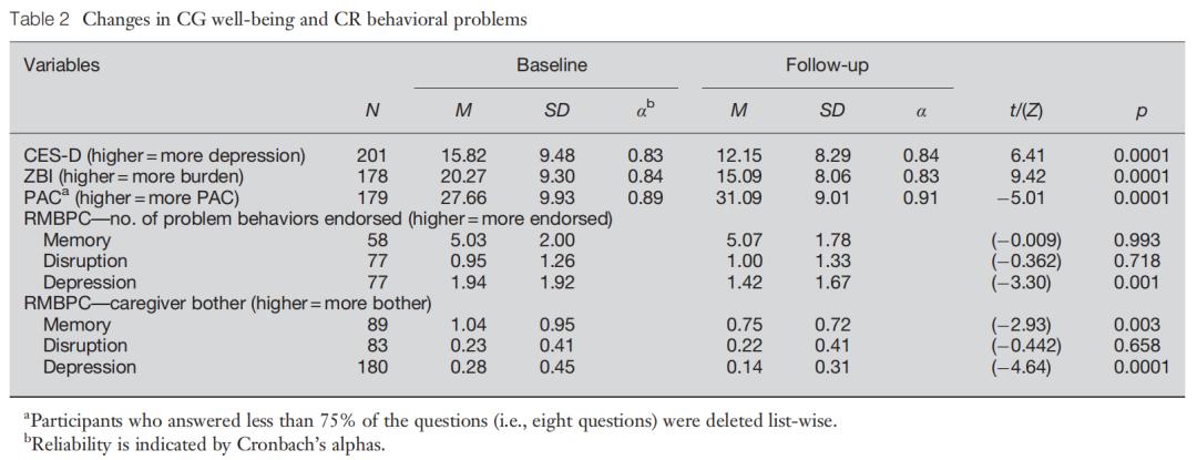 本研究采用被试内t检验(within-subject t-test)比较基线期和跟进期内各分量表的得分。由于照料者的记忆与行为问题检查量表的结果不服从正态分布,研究团队使用了Wilcoxon符号秩次检验来比较基线期和随访时照料者记忆和行为问题量表的得分。所有的分析均使用SPSS 20.0.完成。