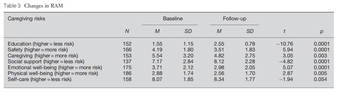 表2显示了照料者的抑郁症状、主观照料负担、照料经历的积极体验(PAC)以及记忆和行为问题的情况。研究结果显示,较基线测量结果而言,照料者在抑郁症状、主观照料负担和PAC方面展现出统计学上的显著改善(ps< 0.001)。与抑郁相关的行为问题的发生率也显著降低,Z =-3.30, p= 0.001,而与记忆和破坏行为相关的行为问题则没有降低。照料者烦恼程度得分在记忆(Z =-2.93,p = 0.003)和抑郁(Z =-4.64,p< 0.001)方面均有显著降低。然而破坏行为分量表的照料者烦恼程度得分下降则并不显著,表3报告了风险评估的结果。除自我关注外(p=0.054),所有照料风险分量表(教育、安全、照料、社会支持、情绪健康、健康)(p < 0.005)均有显著改善。