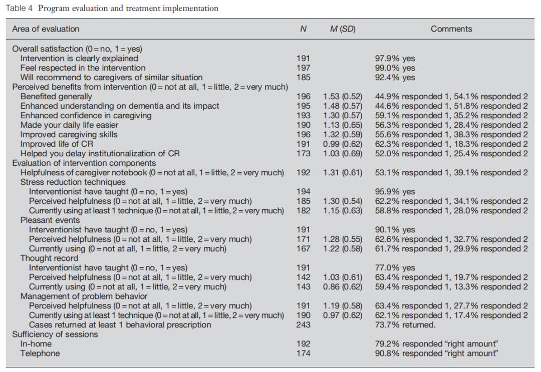 表4显示了项目评估和干预实施的结果。大多数的参与者对该项目感到满意,并在提高老年失智症知识和护理技能方面受益匪浅。项目中各部分的执行率都很高,执行率大致在77.0%(思想记录部分)至95.9%(减压方法部分)之间。总共有73.7%的参与者至少向研究小组反馈了一份行为处方副本。大多数参与者认为这些方法部分是有用的,在干预期间,他们在日常生活中也采用了教授的技巧。