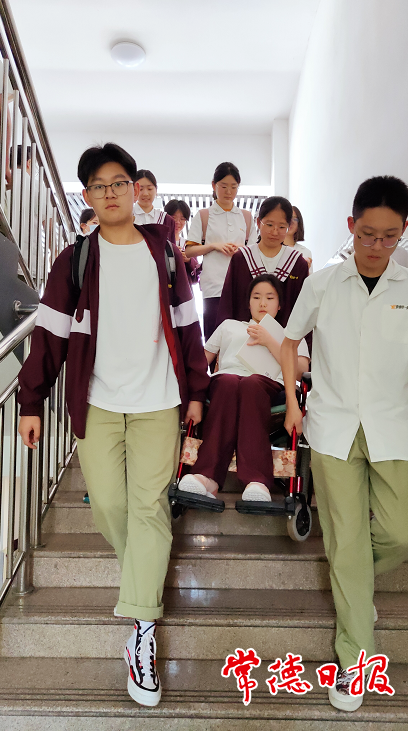 高二和高三年级教室调整到楼上,每天上下楼梯是一件麻烦事。但在学校里,大家经常能看到这样的暖心感人画面——乐于助人的同学合力抬着坐在轮椅上的李好上下楼。“在一中,人人都是李好的电梯。”她的妈妈罗丽说道。