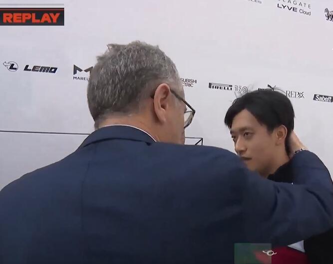 现场画面同时也切到了周冠宇,他看上去没有受伤,还在和F1首席执行官多梅尼卡利交流。