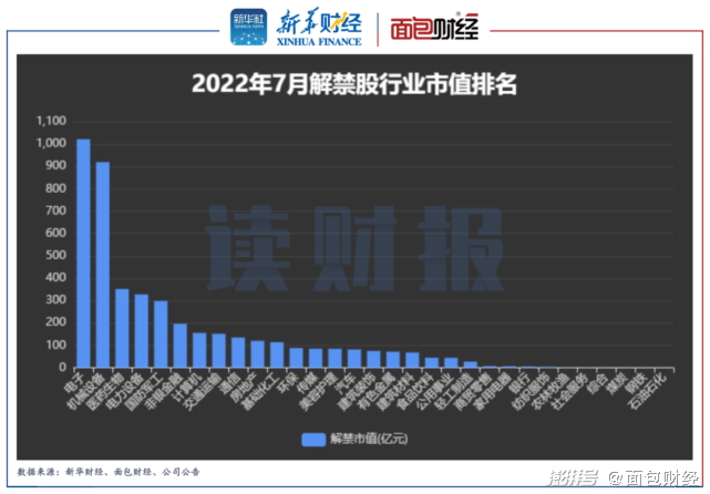 2022年7月,A股将有260家公司的限售股面临解禁,合计解禁量约为263.51亿股,解禁规模超4000亿元,在全年中处于中上规模。从行业分布来看,电子、机械设备、医药生物解禁市值分别位列前三。其中,澜起科技解禁规模居首,解禁市值超300亿元。