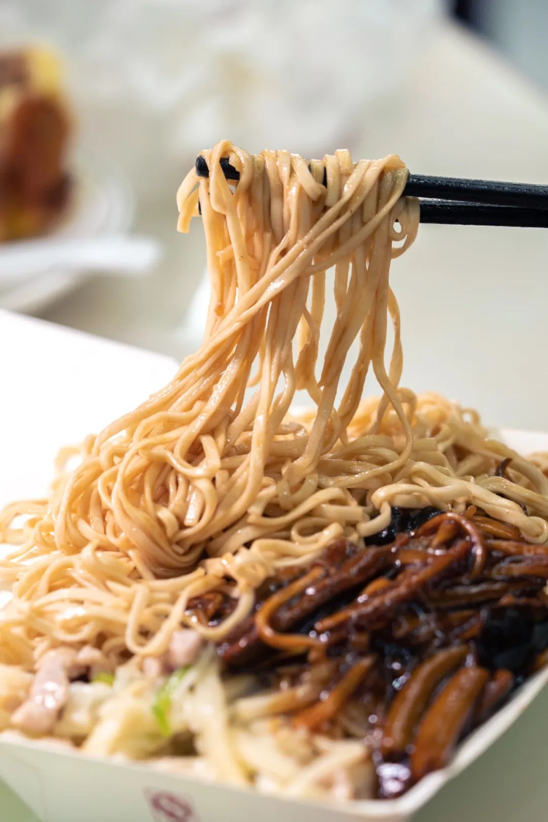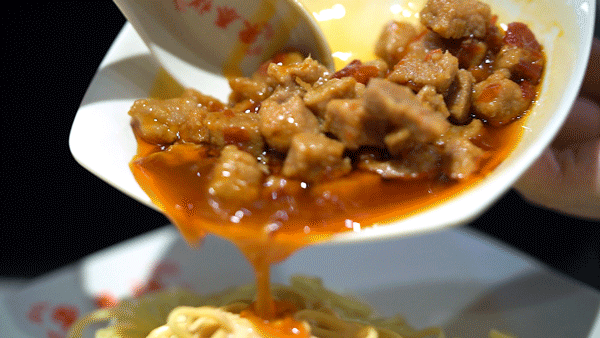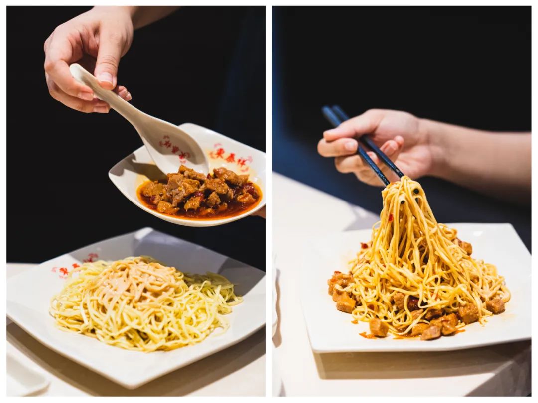 我们选了最经典的辣肉浇头,虽然不是现炒的,但依然能吃得出劐气。肉丁在辣油中泛着迷人的光泽,空口吃就已经足够出色,是上海人钟爱的甜辣口。