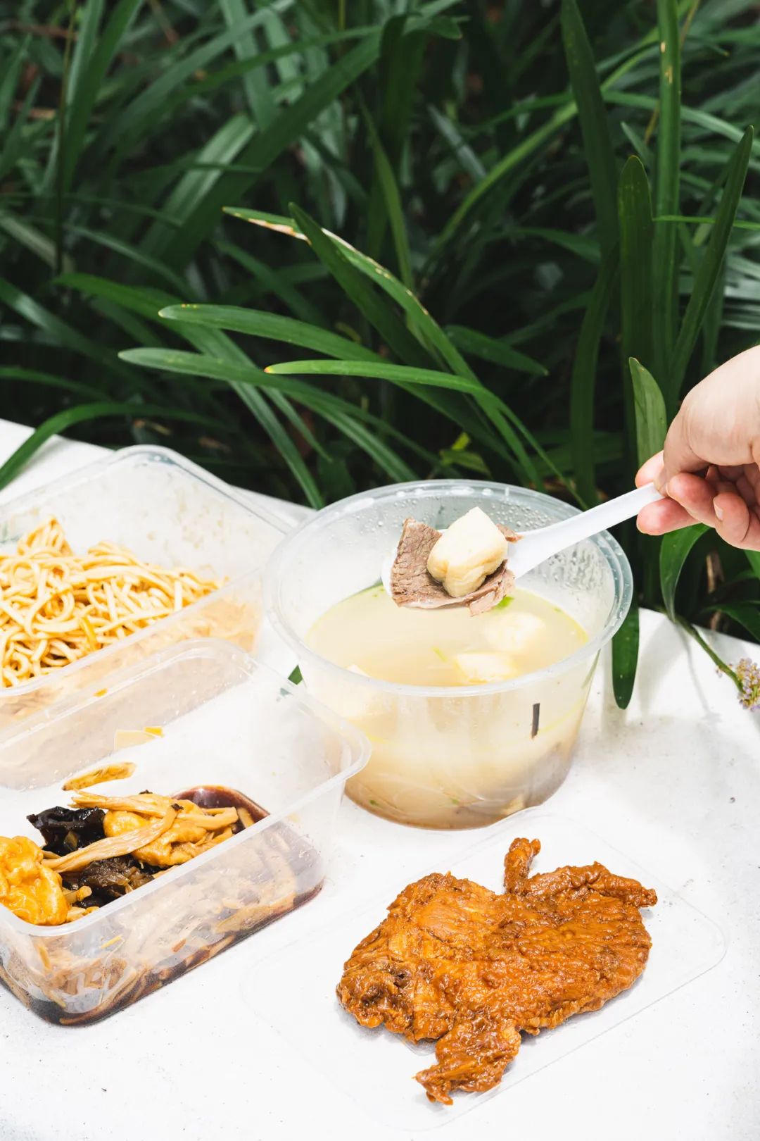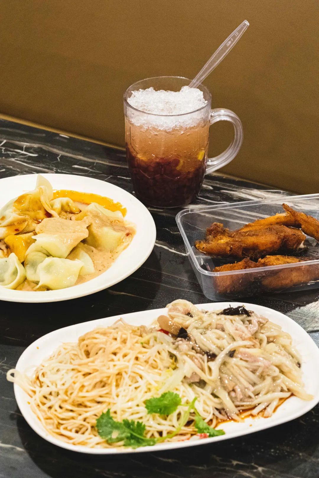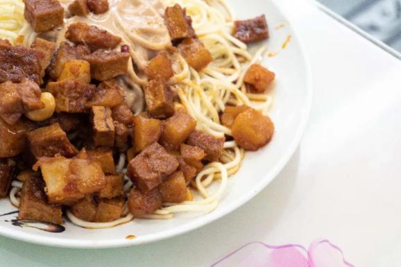 木耳面筋黄花菜是我们不变的纯素选择,面筋吸饱了酱汁,甜津津的;木耳吃起来爽口开胃。老一辈吃冷面,喜欢配一碗咖喱牛肉汤。一把粉丝,佐以两三片薄牛肉和几块油豆腐。咖喱味道不重,不算很辛辣,一碗下肚,妥帖舒服。冷馄饨也出彩,菜肉芯子紧实鲜甜,包裹上厚厚的一层花生酱,一口咬下,汁水四溢。
