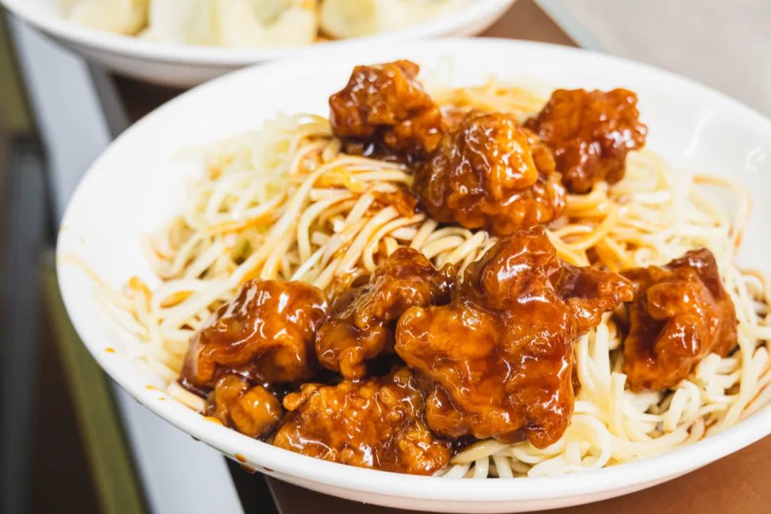 一份浇头大概有7-8块小肉,用的是猪梅肉,肉质紧实,酸酸甜甜,很熟悉的本帮调味。酱汁勾芡程度正好,全倒在冷面上,看这发光的色面,太嗲了!