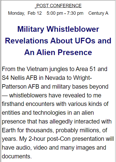 以上视频片段就来自于豪伊参加2018年2月在洛杉矶举办的“有意识生命博览”大会现场发言。“有意识生命博览”会议主办方在推特上放出了嘉宾演讲主题和时间表。可以看出,豪伊的讲演题目就是“军队中的吹哨人揭露不明飞行物和外星存在”。