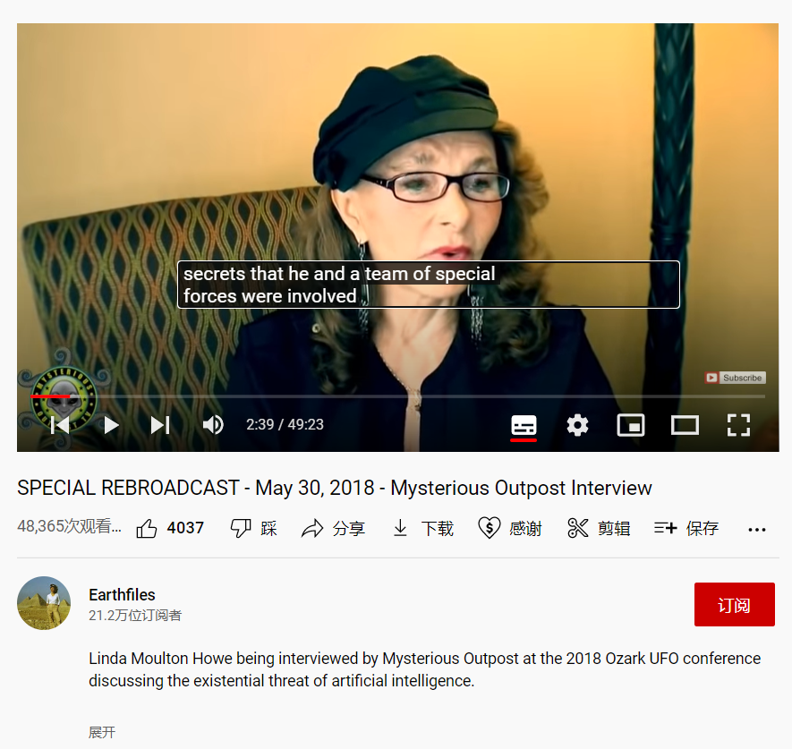 明查视频中的女子名为琳达·莫尔顿·豪伊(Linda Moulton Howe),自称“调查记者”,创立了网站“地球文档”(earthfiles.com)。她的YouTube频道Earthfiles有21.2万订阅,一直保持频繁更新。其发布视频的内容十分统一,围绕同一个主题展开,即论证“外星生命”和UFO的真实存在。