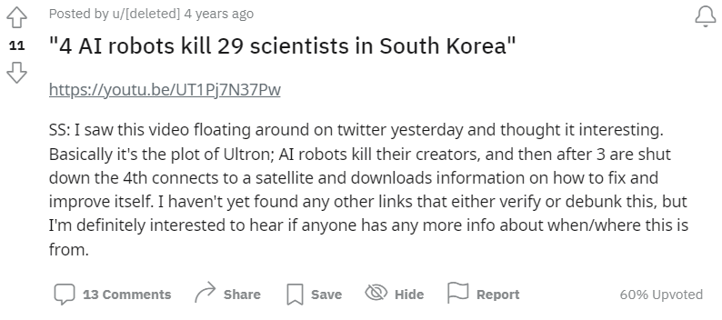 除此之外,用日语搜索关键词“AIロボットが殺す”(人工智能机器人杀人),并将时间限定在2017年8月,并未发现任何相关报道。不过进一步搜索发现,有关传言发生了畸变。有网友在Reddit的“阴谋论”板块(r/conspiracy)提问“4个人工智能机器人在韩国杀死了29名科学家”一事是否属实。这一说法仍是基于2018年2月豪伊的演讲,因此也没有任何依据。
