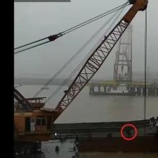 约0703时,遇难水手接过挖泥船船员递送过来的钢丝绳系缆的琵琶头,并把它套挂在系缆桩上。
