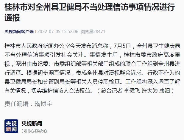 7月5日,全州县卫生健康局不当处理信访事项引发社会关注。事情发生后,桂林市委市政府高度重视,派出由市纪委、市委组织部等相关部门组成的联合工作组到全州县进行调查。根据初步调查情况,责成全州县对漠视群众诉求、行政不作为的县卫健局局长和分管副局长等相关人员停职检查。工作组将深入调查了解有关情况,切实维护信访人合法权益。