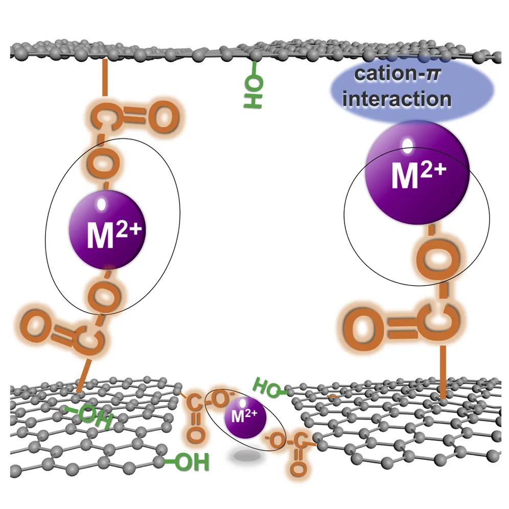 控制通过氧化石墨烯(GO)膜的离子传输具有挑战性,尤其是在水环境中,因为氧化石墨烯(GO)膜具有很强的溶胀倾向。微调层间距和化学性质对于制造高选择性膜至关重要。芝加哥大学刘翀教授团队对单点二价阳离子在调节GO膜特性中的作用进行了深入研究。竞争性离子渗透测试表明,Cu2+阳离子通过GO膜的2D通道的传输超过其他阳离子(Mg2+/Ca2+/Co2+)。在没有/使用单点M2+修饰的情况下,原始GO、Mg-GO、Ca-GO和Cu-GO膜在湿态下的层间距分别为~13.6、15.6、14.5和12.3 Å。与原始GO、Mg-GO和Ca-GO膜相比,Cu-GO膜的NaCl(1 M)渗透率降低了两倍。在使用1000 ppm的NaCl和Na2SO4作为进料的反渗透测试中,Cu-GO膜的截留率分别为~78%和~94%,比对应的膜高5%~10%。电催化膜去除水和废水中微污染物的最新进展