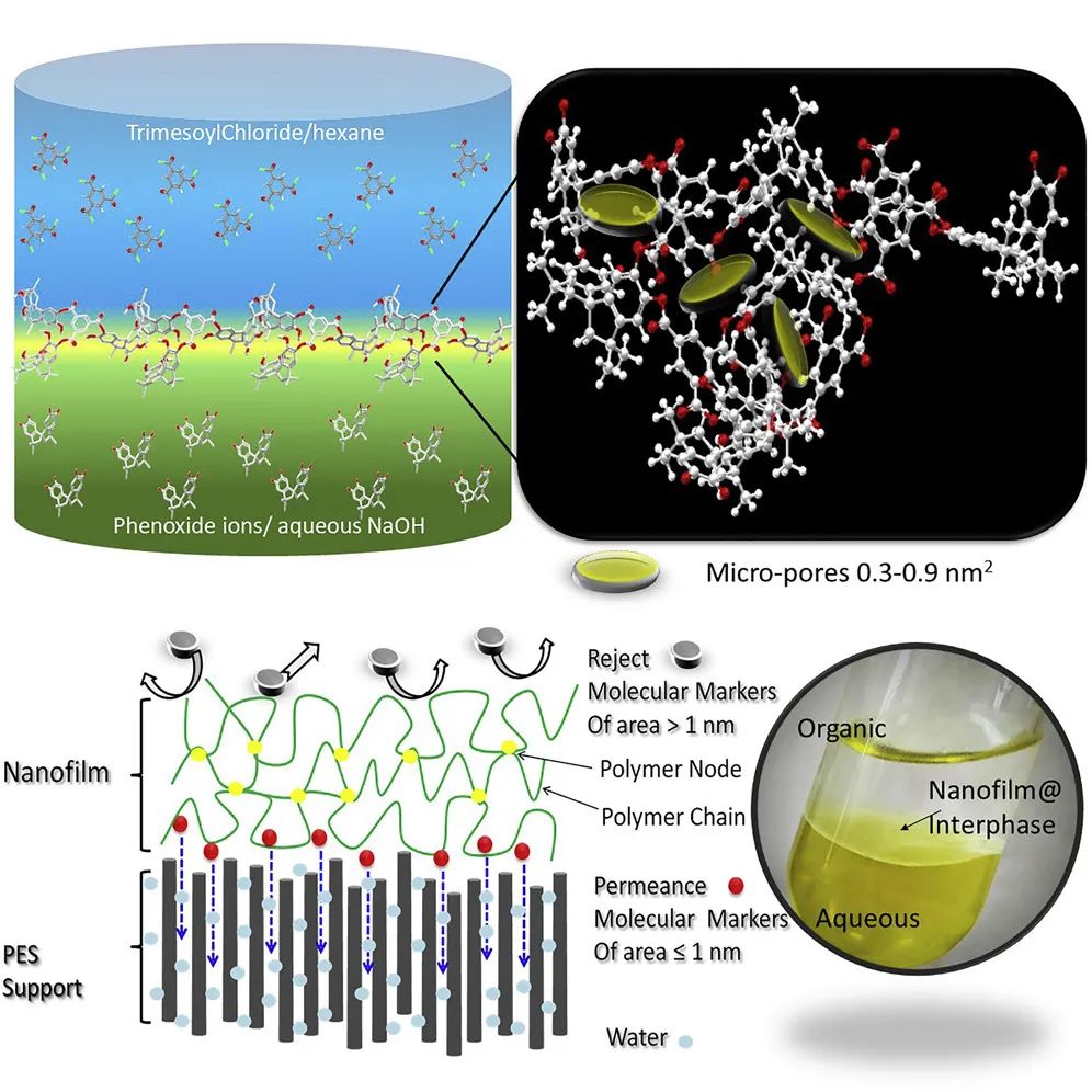 具有高渗透性和选择性的聚合物膜是水处理的理想方法。具有中等截留分子量(MW在400和700 g mol-1之间)的分离膜对于从水流中分离多价离子和小分子具有理想的分离效果。为最大限度地提高聚合物膜的分离性能,需要制备一类具有可控孔隙、孔径分布、表面电荷和薄活性层的聚合物膜。CSIR-中央盐与海洋化学研究所Shilpi Kushwaha和Ketan Patel研究团队报道了在超滤载体上使用界面聚合方法合成的厚度低至15 nm的聚芳基纳米膜的制备过程。电子显微镜分析揭示了聚芳基纳米膜中存在皱褶的表面形态。聚芳基纳米薄膜表现出约110 Lm-2 h-1 bar-1的高透水性,截断分子量大于∼450 gmol-1(分子标记),透水性为∼84 Lm-2 h-1 bar-1。与单价盐(~5%)和二价盐(~28%)相比,多价盐(K3[Fe(CN)6])具有更高的截留率(>95%),其水渗透率为~81 Lm-2 h-1bar-1。纳米功能化膜材料去除污染物的最新进展