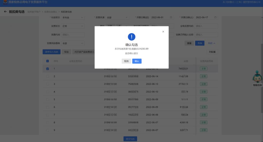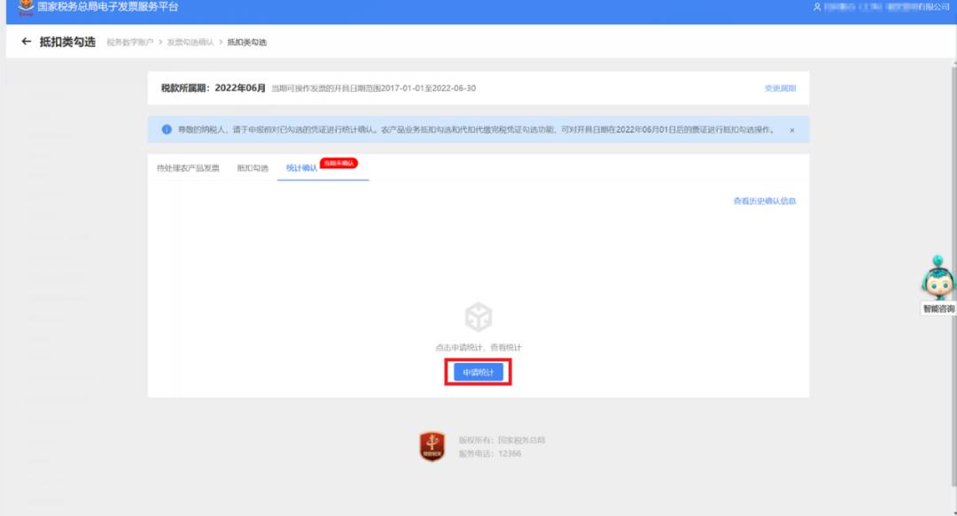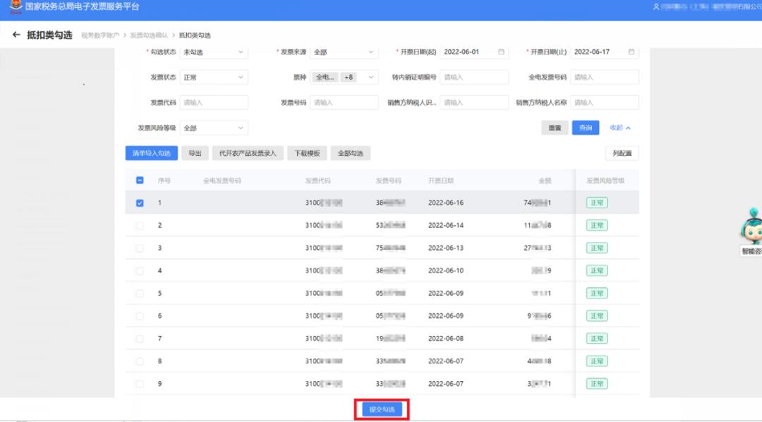 相关路径:发票勾选确认——抵扣类勾选查询——提交勾选——统计确认