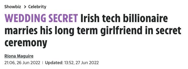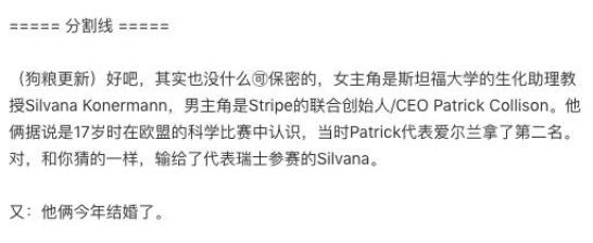 男方是估值近千亿美元的全球支付巨头Stripe公司创始人/CEO Patrick Collison。