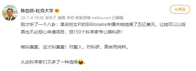 某名校女PI的Billionaire未婚夫给她捐了五亿美元,让她可以以后再也不必担心申请项目,招150个科学家专心搞科研!