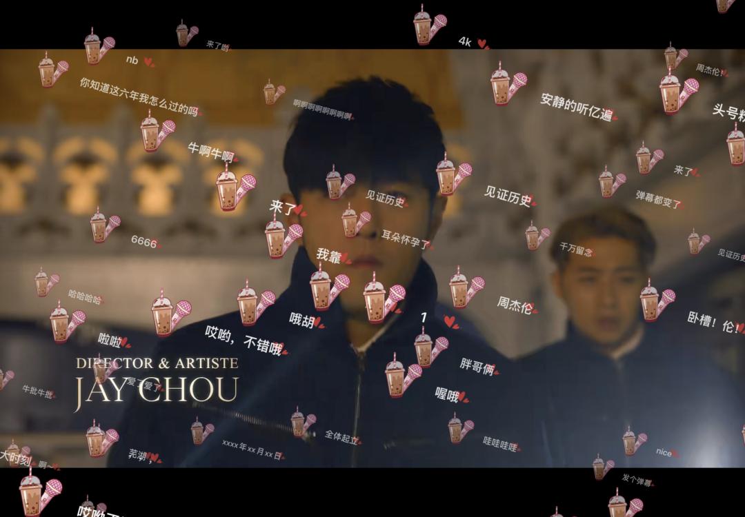 除了常规的宣传之外,各平台还花样百出,意图吸引受众注意。比如TME稍早时间就推出了周杰伦相关周边,比如“营业·周”、“画饼·周”、“布鸽·周”三款手办,以及戒指、项链、手链等饰品;B站MV视频则一打开就被话筒加奶茶的弹幕刷屏。