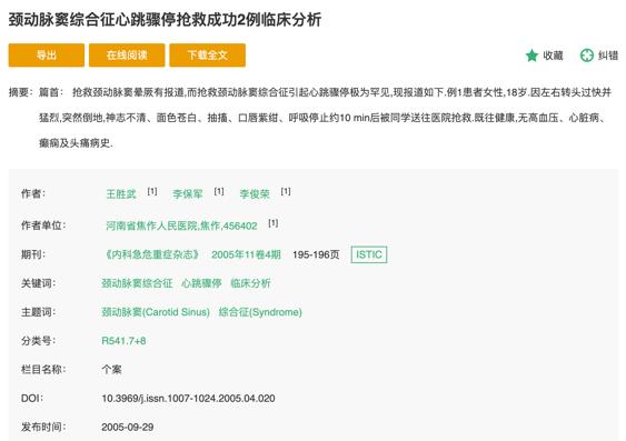 2.王胜武,李保军,李俊荣.颈动脉窦综合征心跳骤停抢救成功2例临床分析[J].内科急危重症杂志,2005,11(4):195-196.DOI:10.3969/j.issn.1007-1024.2005.04.020.