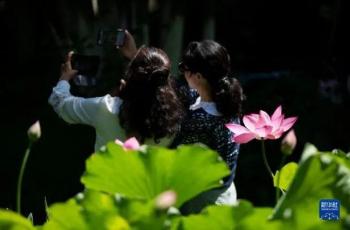 7月6日,游客在大观公园内与盛开的荷花自拍合影。新华社记者陈欣波 摄2. 夏日风湿有“三防”:防风、防冷、防日晒