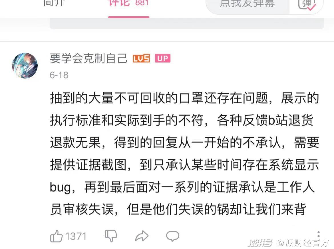 该up主在评论区称,抽到的大量不可回收的口罩还存在问题,展示的执行标准和实际到手的不符,各种反馈B站退货退款无果,得到回复也多次变更,从拒不承认到系统bug,再到人工审核失误,借口频出不解决问题。