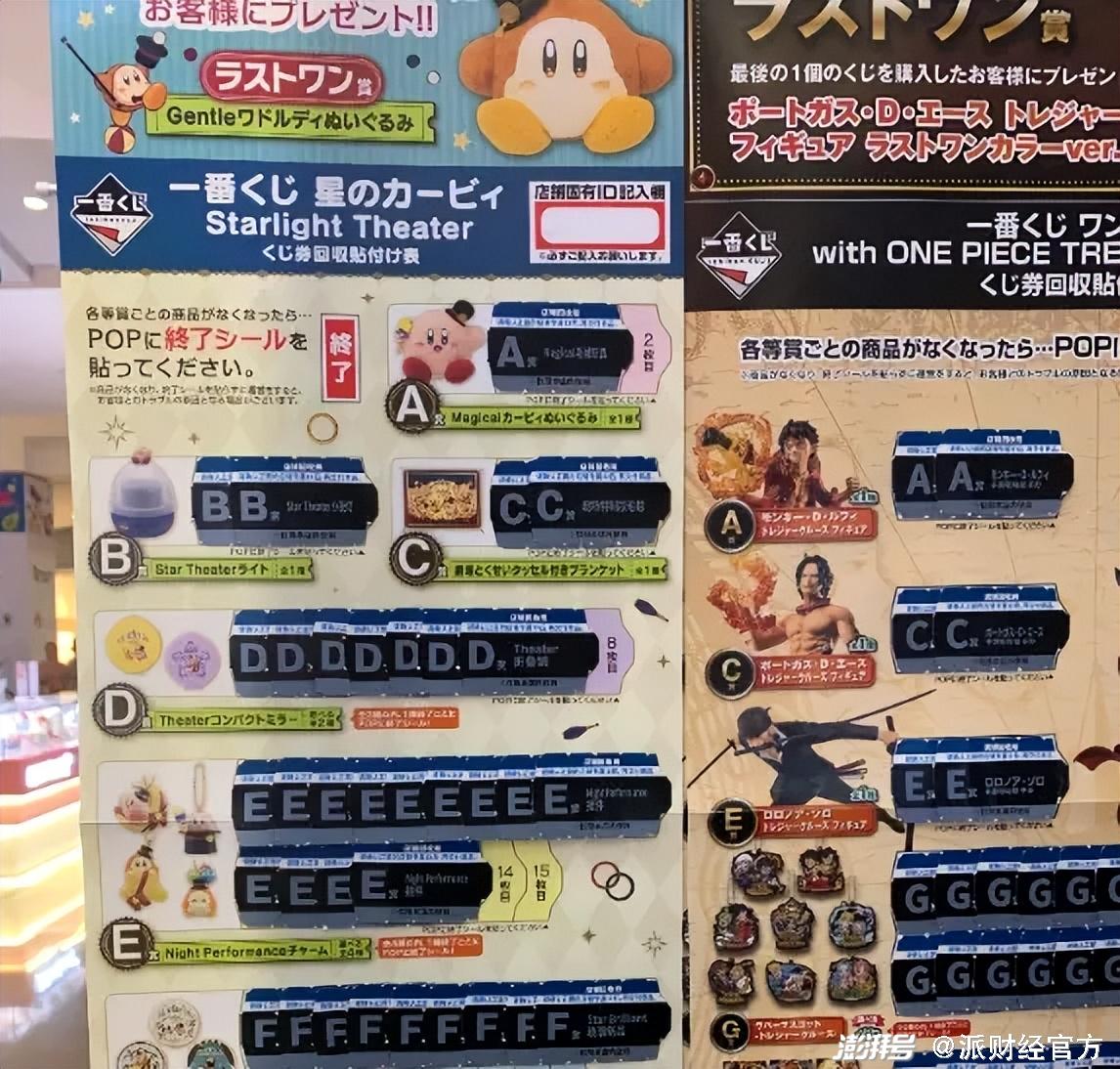 在日本,一套一番赏商品大约有70-80张奖券,单张奖券600-850日元不等,奖项以ABCDE等为序列。字母越靠前,奖品越稀缺,概率越低,例如模型、玩偶等;反之奖品越廉价、概率越高,例如毛巾、吊饰、文具等。
