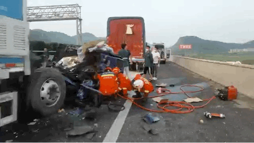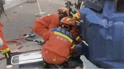 由于被困人员,腿部被卡,消防员利用破拆工具,将事故车辆副驾驶位置侧门卸下,用液压顶杆将压扁的驾驶室撑开,开辟出足够的空间,再用破拆工具把压在副驾驶室2名被困人员的脚上的座位移开,在医护人员配合下利用担架先后将2人救出。