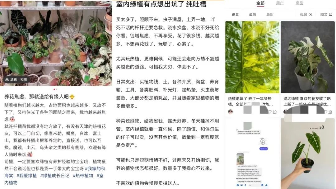 社交平台上也有网友同样感到焦虑,“随着植物们越长越大,占地面积也越来越多,又放不下了,又挡住光了,各种问题随之而来,我也越来越焦虑……”除此之外,也有不少网友发布“退坑”笔记,而在二手平台,不少出绿植的商品详情也提到“退坑了,转手”。