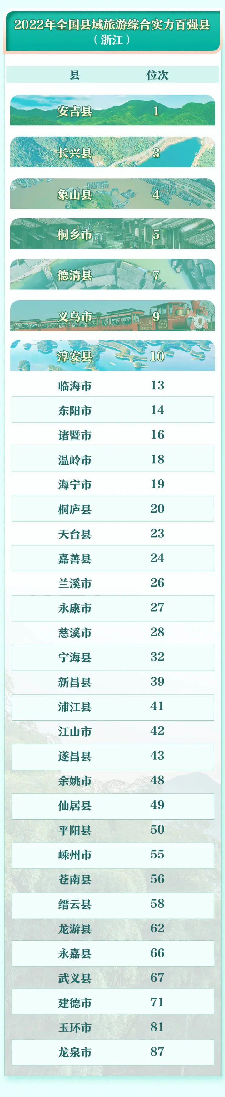 2022年全国县域旅游研究对象为内地1866个县(含县级市、自治县、旗、自治旗、特区、林区)。县域旅游综合实力研究从旅游经济发展水平、政府推动作用、旅游产业综合带动功能、旅游开发与环境保护、旅游设施与服务功能、旅游质量监督与市场监管6个方面35个指标构建研究体系,得分居前100位的即为2022年全国县域旅游综合实力百强县。