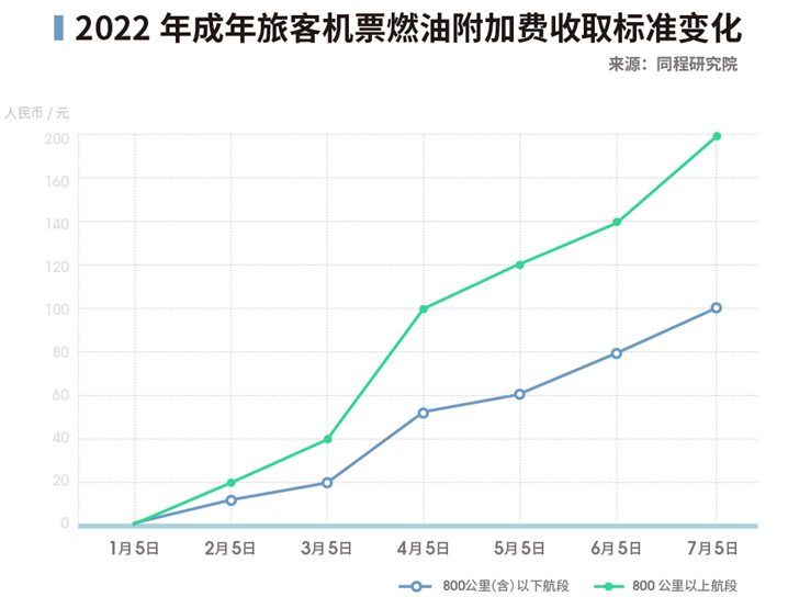 从2022年7月5日零时起,燃油附加费收取标准再度上调,成人票收费政策为800公里(含)以下航线每位旅客收取人民币100元;800公里以上航线每位旅客收取人民币200元。