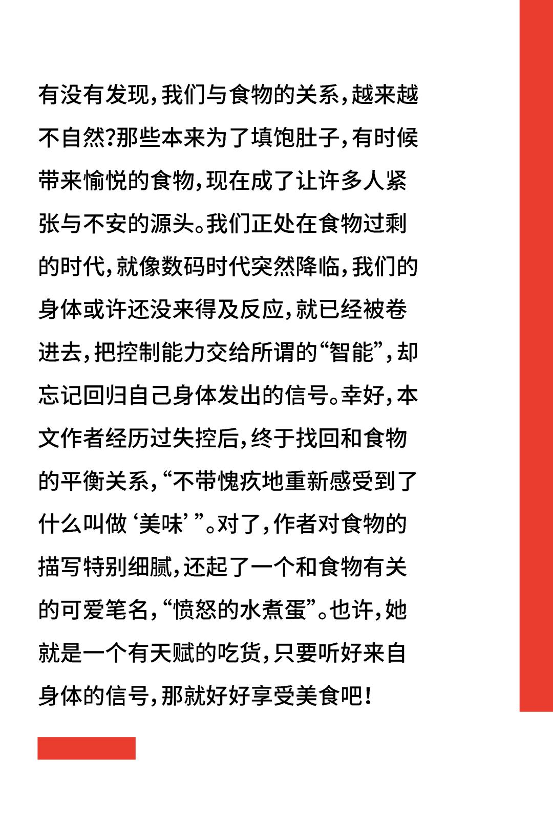 我开始规律地练习吃东西,不是为了吃到哪个卡路里而吃,也不是为了吞咽而吃。每天一顿饭,到两顿饭……这次,回归自己身体发出的信号,忘记那些数字和食物清单。人类在温饱的基础上发明创造了这么多的美食,是为了让我们更好地重视身体的感受。这是我应该重新修复的,在这几个月里丢掉的东西。