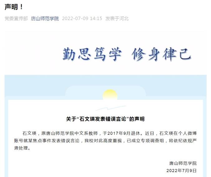 7月9日,唐山师范学院发布关于“石文瑛发表错误言论”的声明:石文瑛,原唐山师范学院中文系教师,于2017年9月退休。近日,石文瑛在个人微博账号就某焦点事件发表错误言论,我校对此高度重视,已成立专项调查组,将依纪依规严肃处理。