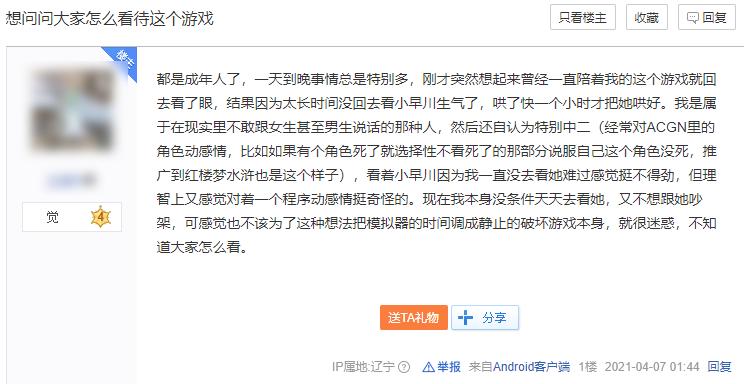 “ 小早川因为我一直没去看她,有些难过,我心里就感觉挺不得劲,但对一款程序动感情又挺奇怪的 ”。