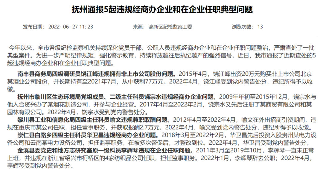 江西省抚州市纪委监委近日通报5起违规经商办企业和在企业任职典型问题,其中,多名干部违规兼职取酬、违规在企业任职的案例引发关注。